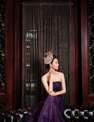 紫色礼服总在成熟的韵味之中显露着高贵品质,当戚薇身着此款兰斐礼服,精细的暗花设计和高品质的材质选取将整个人的气质衬托得如此无暇——她是入世的新娘,也是出世的丽人,如出水芙蓉,却风姿绰约。